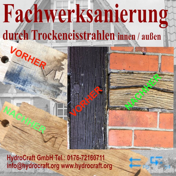 Schützen Sie Ihr Fachwerk, durch die Entfernung einer in der Vergangenheit eingesetzten nicht-permeablen Holzversiegelung, vor dem Verfall. Ersetzen Sie zum Erhalt des Fachwerks alte Versiegelungen, durch permeable (offenporige) Anstriche. Bei unterdrückter Wasserdampfdiffusion erfährt das Holz (als statischer Träger Ihrer Immobilie) und somit das gesamte Bauwerk Schaden. Sprechen Sie mit Ihrem lokalen Zimmermann! Die Methode des Trockeneisstrahlens entfernt alte Versiegelungen und strukturiert im Außen- sowie Innenbereich. Sauber, trocken, effektiv und ohne Sekundärabfälle.